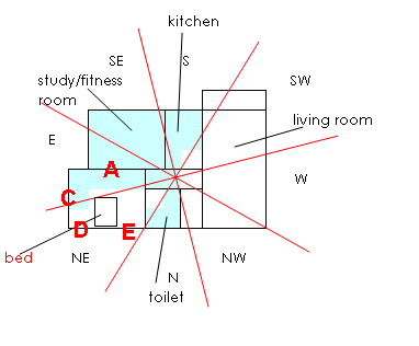 Marking `D and E' - preferably, the bed should rest against a solid wall. And it is acceptable to have windows on the side of the bedroom at location marked `D' and/or `E'.